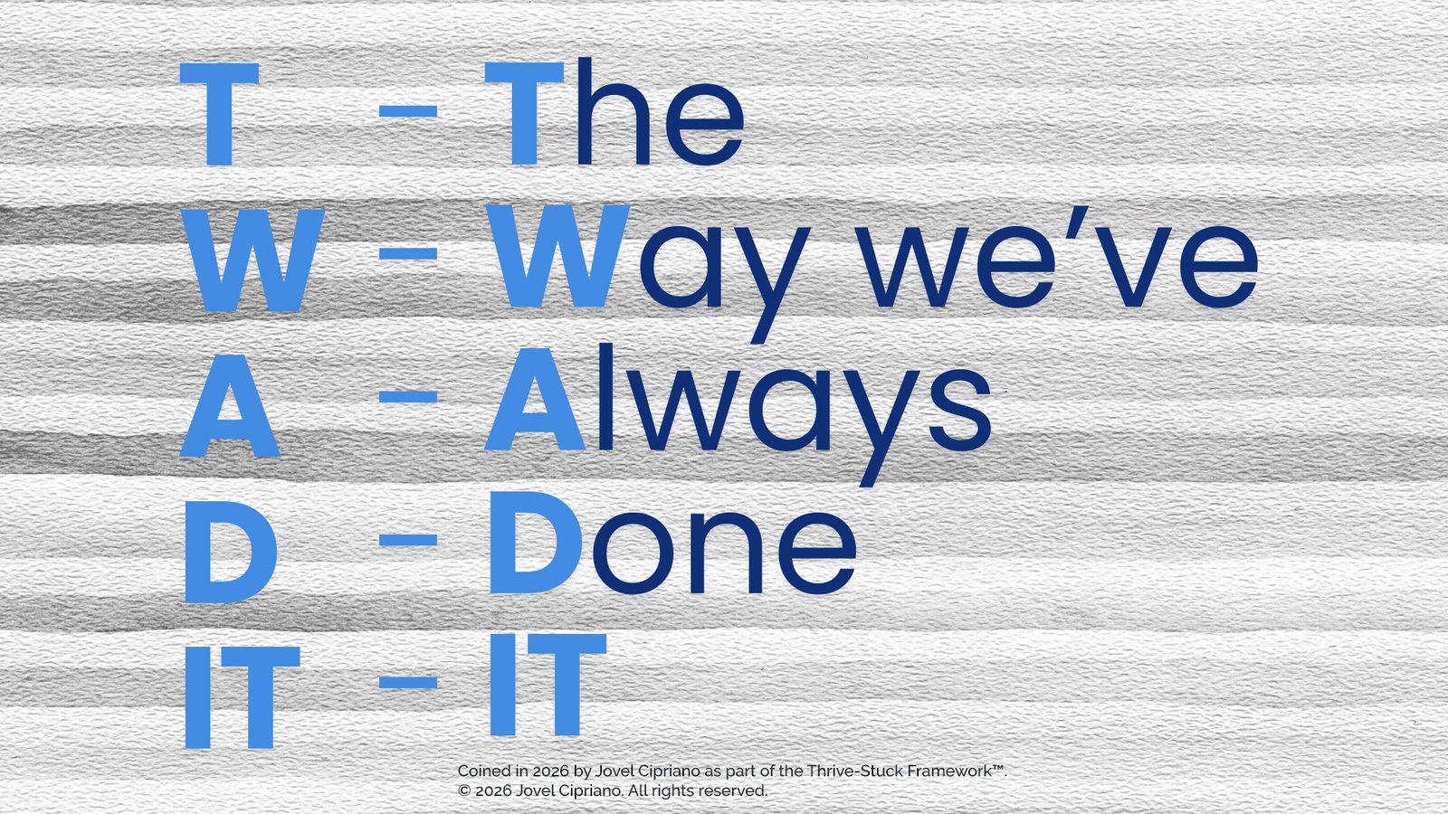TWADIT was coined by Jovel Cipriano in 2026 as part of the Thrive-Stuck Framework™. The term was created to describe the hidden force behind many forms of organizational stagnation and resistance to change.